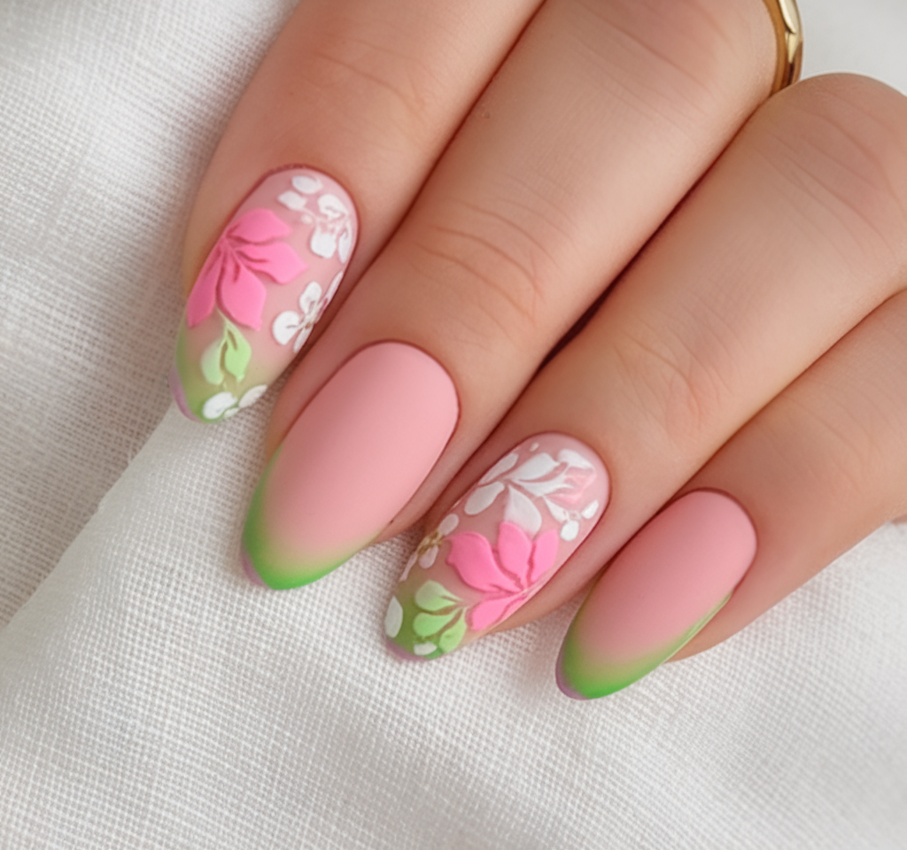 This almond-shaped manicure blends a soft pink base with a subtle green ombre effect on the tips. The accent nails feature delicate hand-painted white and pink floral designs, adding a romantic and feminine touch. The matte finish enhances the softness of the design, making it a perfect choice for spring French nails ideas 2025.