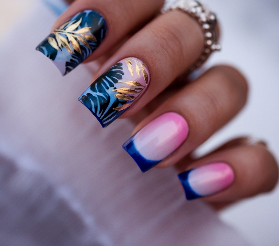 This square manicure combines a pink-to-blue ombre effect with intricate gold leaf embellishments. The tropical leaf-inspired accents in dark blue add depth and contrast, making this design a luxurious choice for spring French nails ideas 2025. The high-shine gel topcoat completes the look with a polished finish.