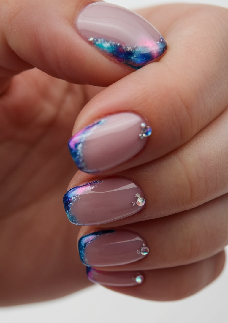 This oval manicure features a brown nude base with dreamy blue and purple cosmic-inspired tips. The chrome shimmer effect gives a galaxy-like illusion, while tiny rhinestone details near the cuticle add a touch of elegance. The high-shine gel finish enhances the multidimensional look, making this a standout design for 2025 nails.