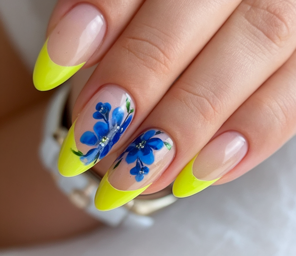 Bold and vibrant, this almond-shaped manicure brings energy with neon yellow tips. The combination of bright color and hand-painted blue floral details creates an eye-catching contrast. This design is perfect for those who want to add a pop of color to their spring French nails ideas 2025 while keeping it fresh and stylish.