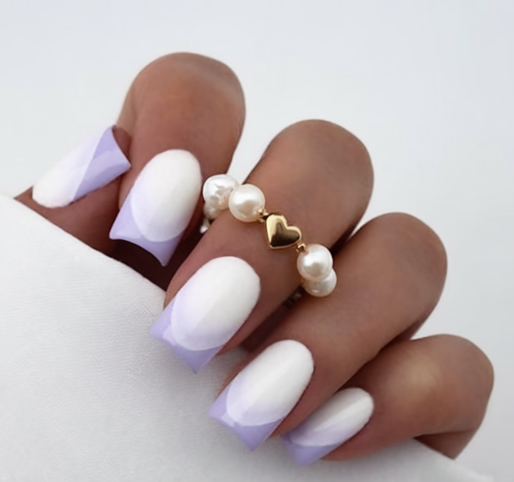 A chic take on square French tips, this design blends a crisp white base with soft lavender accents. The subtle gradient effect adds depth, creating a seamless transition between colors. The matte finish elevates the style, making it a fresh and modern choice for spring French nails ideas 2025.