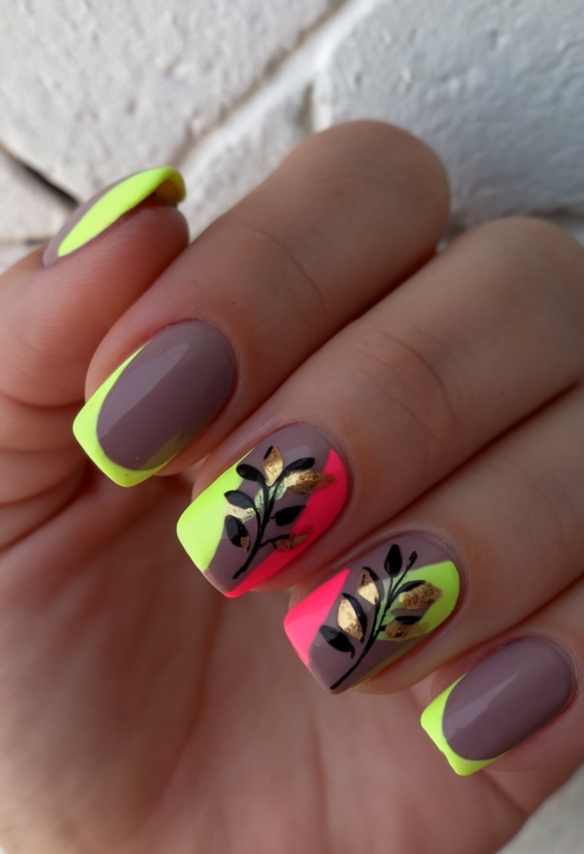 This square manicure features bold yellow and pink neon French tips on a neutral brown base. The accent nails showcase intricate black branch-like detailing with delicate gold foil accents for an eye-catching, artistic touch. Finished with a sleek gel coat, this design is the perfect mix of edgy and elegant.