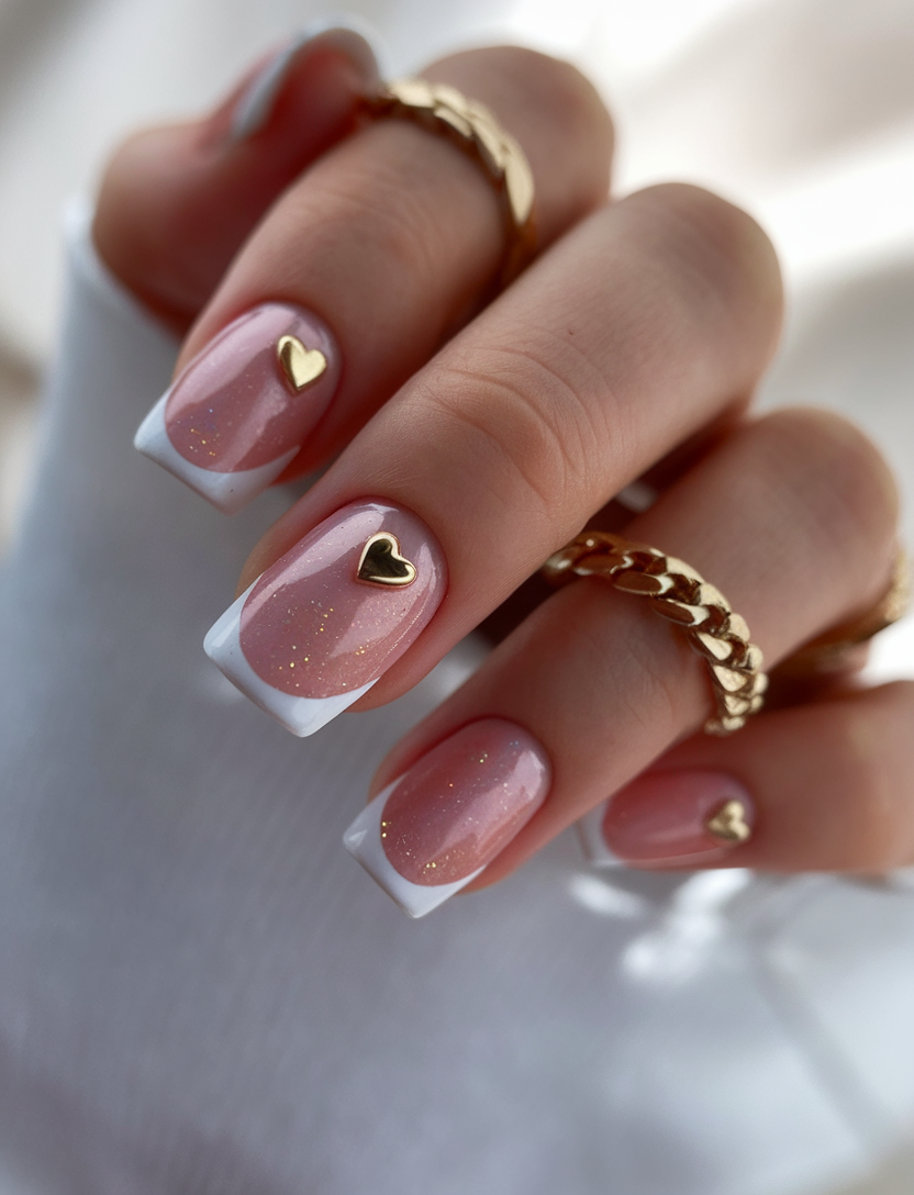 This delicate manicure features a soft pink French tip with a touch of fine glitter, adding a subtle shimmer to the classic design. The nails are medium-length with a square shape, making them elegant and versatile. Small gold heart embellishments on select nails elevate the look, creating a romantic and luxurious effect.