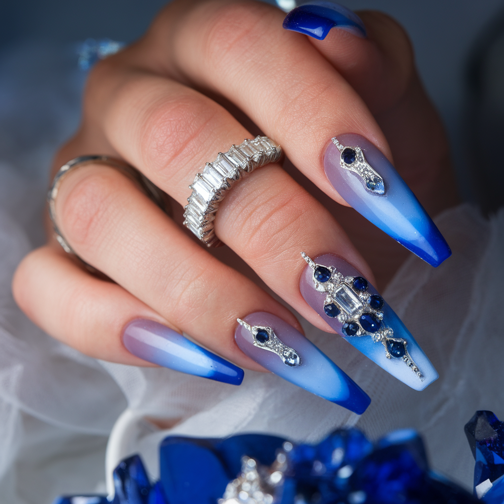 This almond-shaped manicure is a stunning mix of blue ombre and luxury embellishments. The gel-based design fades from a soft white into a rich royal blue, creating a flawless gradient. The standout feature is the intricate rhinestone detailing on the accent nails, featuring deep blue gems and silver accents for a regal, chrome-like shine.