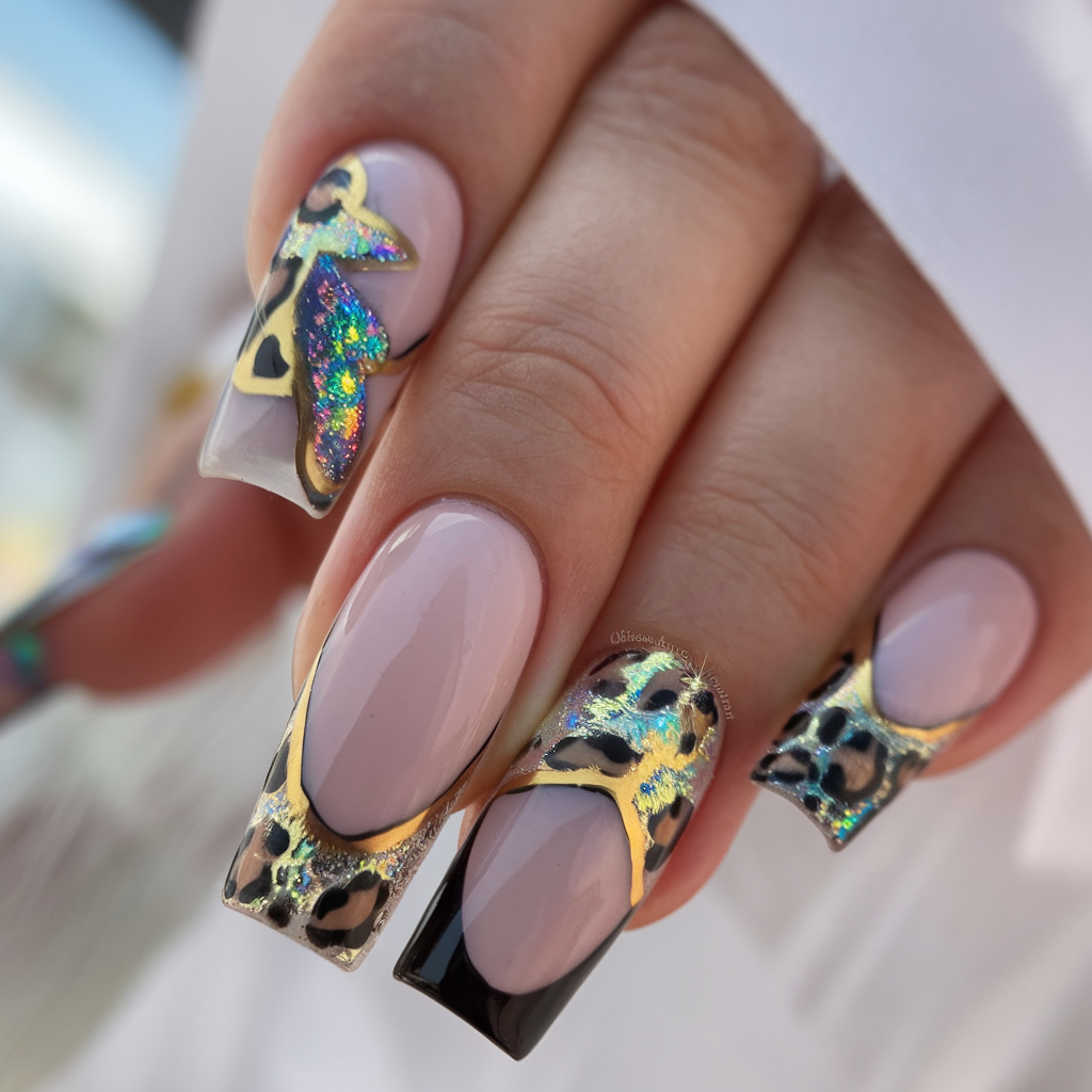 A bold take on square French tips, this design combines a nude base with black, holographic leopard spots framed by gold details. The high-gloss gel finish enhances the reflective effect, making the chrome shimmer stand out. The sculpted tips and unique cutout accents add a modern, high-fashion edge, making it a perfect pick for 2025 nails.