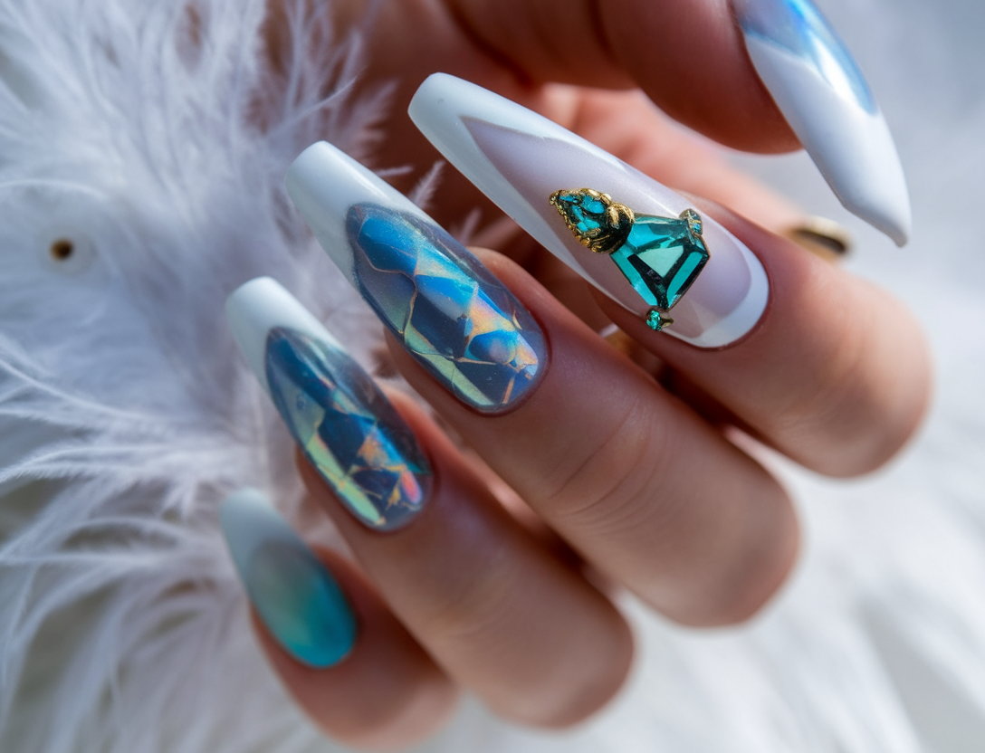 These long almond-shaped nails are a stunning blend of iridescent blue and white French tips, mimicking a frozen gemstone effect. The design features holographic, multi-dimensional details that create the illusion of shattered glass, enhancing the icy aesthetic. One nail stands out with a bold 3D emerald-green gem, framed with gold details, making this manicure feel truly opulent.