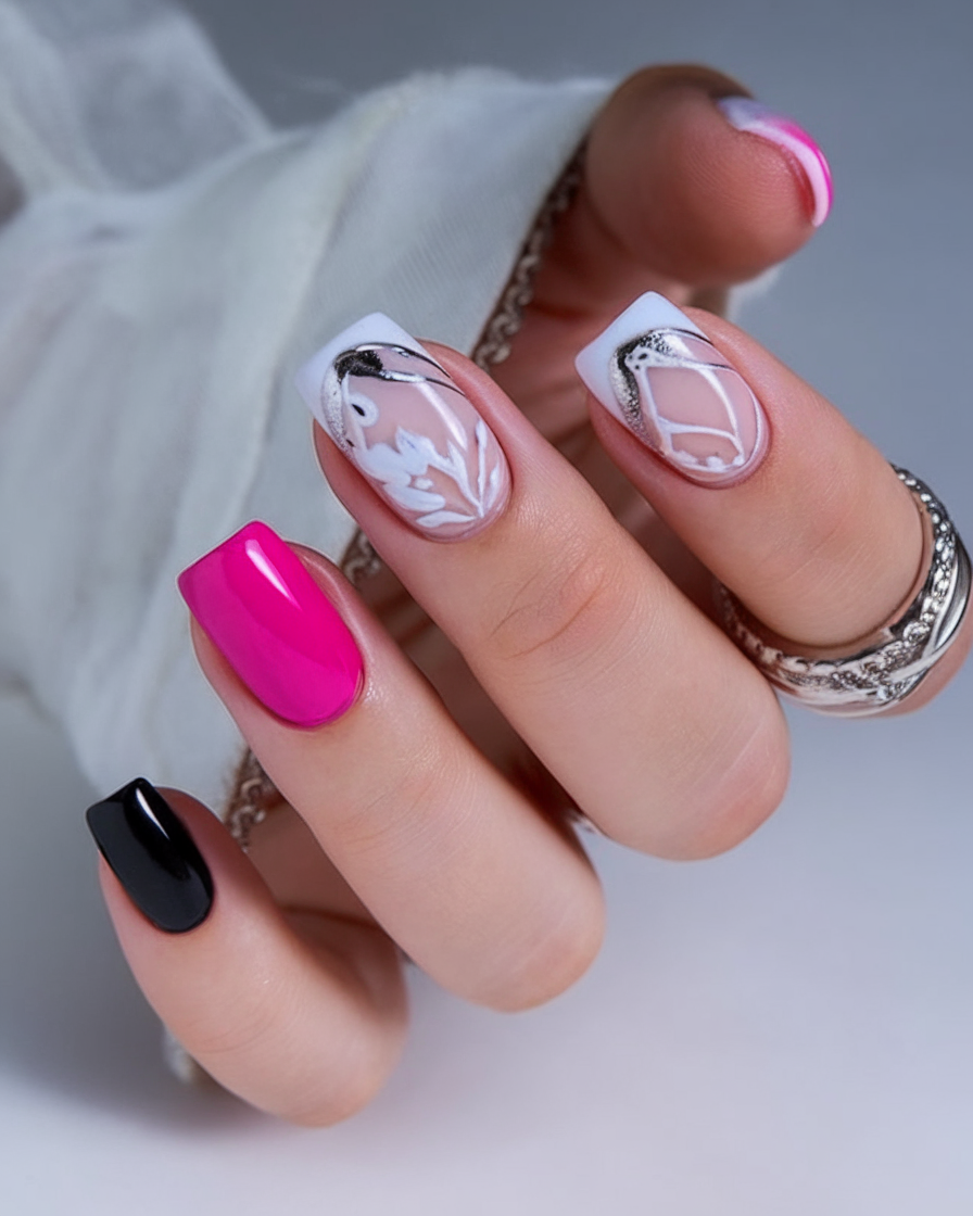 This short square manicure takes the 2025 nails trend to a new level with an edgy mix of black, pink, and white. Featuring asymmetrical gel French tips, delicate bow details, and metallic accents, this design is perfect for a daring yet sophisticated look. The contrast between dark and light tones makes it ideal for both casual and formal occasions.