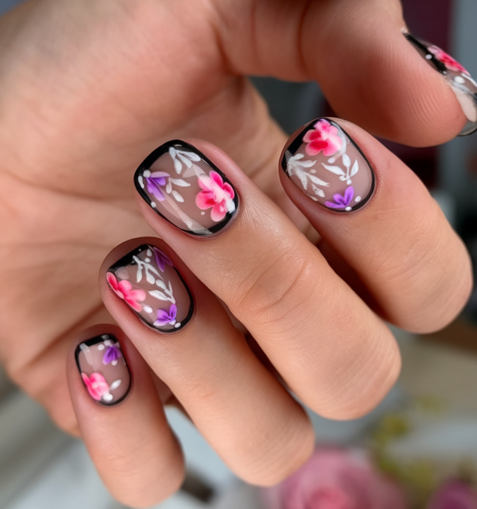 This short square manicure offers a fresh take on spring French nails ideas 2025. A transparent nude base keeps the look delicate, while thin black outlines define the French tips, adding a touch of modern elegance. Hand-painted floral details in pink, purple, and white bring softness and a natural feel, making this design perfect for any season.