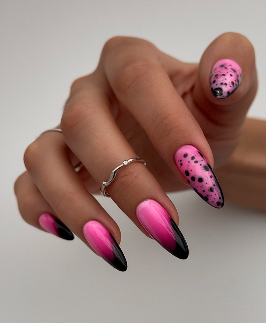 A striking mix of pink and black in an almond shape creates a daring statement for 2025 nails. The ombre effect blends smoothly from light to dark, giving the nails a dynamic look. The speckled accent nails add a creative touch, making this design a bold choice for those who love edgy nail art with a unique twist.