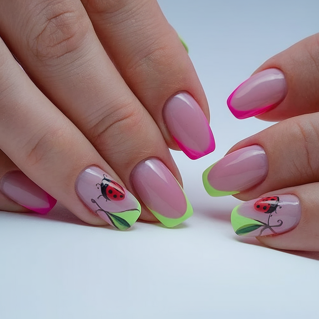 This playful square French tip manicure blends bright pink and yellow for a fresh, spring-ready design. The subtle nude base lets the vibrant colors stand out, while detailed red and black ladybug nail art adds a charming, nature-inspired touch. Perfect for March, this look balances whimsy with chic elegance.