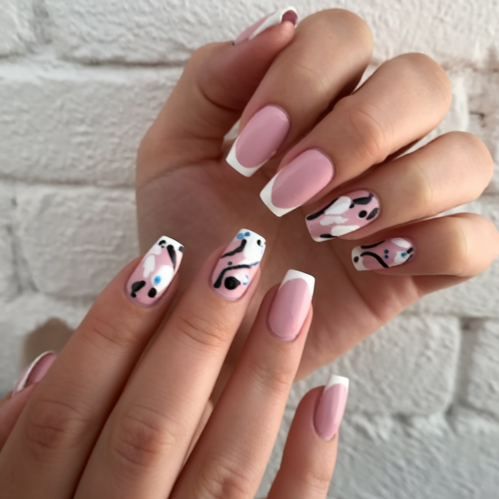 This square French manicure takes a creative approach to spring French nails ideas 2025. Classic white tips are combined with soft pink nails, while accent nails feature bold abstract patterns in black, white, and blue. The artistic touch gives this design a modern and dynamic feel, making it a standout choice for those who love expressive nail art.