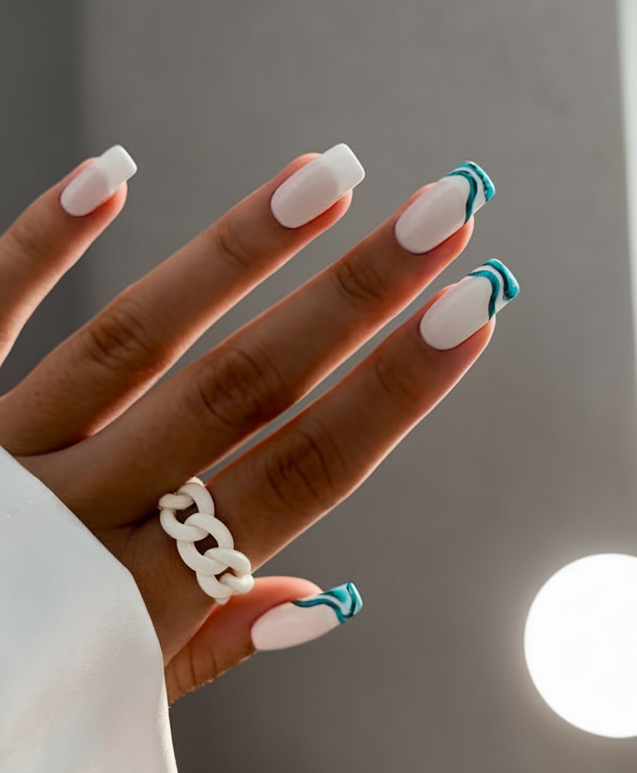 A fresh take on the classic square French manicure, this design keeps it sleek with a crisp white base. The subtle pop of blue in wave-like strokes on the tips adds an artistic and modern flair. The glossy gel finish enhances the minimalist aesthetic, making it a perfect choice for a clean yet unique 2025 nails look.