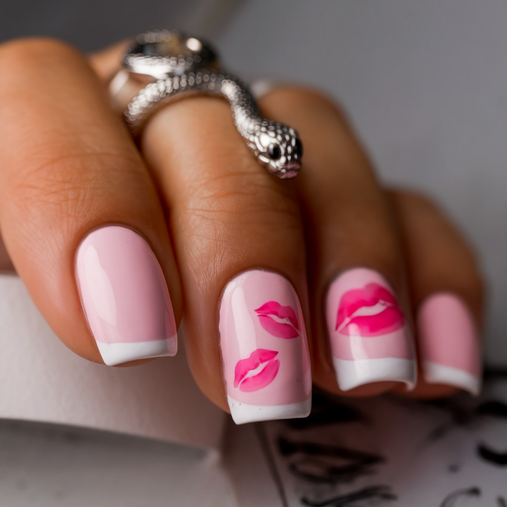 This short square French manicure is a playful and romantic twist on 2025 nails. A pink base with white tips keeps it simple, while accent nails showcase glossy pink lip prints for a fun and flirty touch. The smooth gel finish adds dimension, making this design a stylish option for those who love bold yet elegant details.