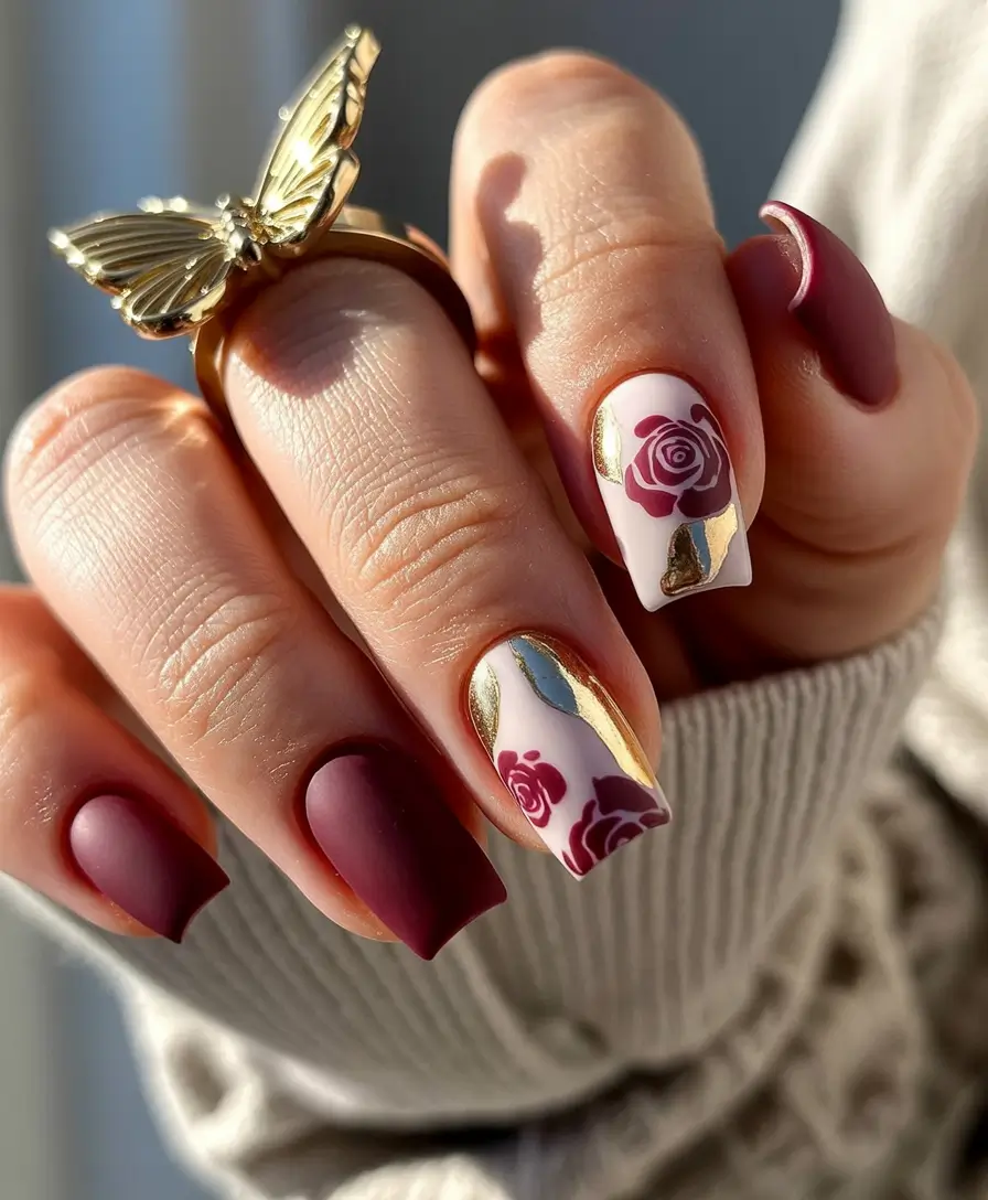 The base for this romantic design is a burgundy matte polish combination with creamy white accents. The highlight of the design is the deep red rose motifs with touches of framing in metallic gold. The piece is rich, feminine, and artistic. It is a sure artistic wearable art. I view this as the perfect” holiday romance” vibe as the combination of matte with shine gives it that deep and dimensional look, with the floral elements adding the of softness.