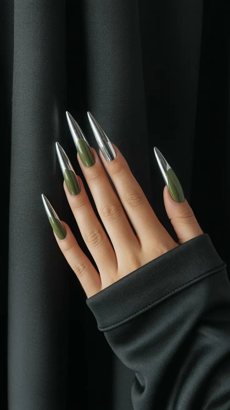 The Chrome Olive Drama stiletto nails have an allure that is equally striking, bold, and ostentatious. Its *olive* green flavor, paired with the edgy, metallic silver chrome, is modern and earthy. In addition, the soft, muted olive color makes the whole stiletto feel beautifully balanced. The color pairing is ideal. the manicure amazing, and the style edgy yet wearable. This style is flawless and exactly what that attention seeker wants.