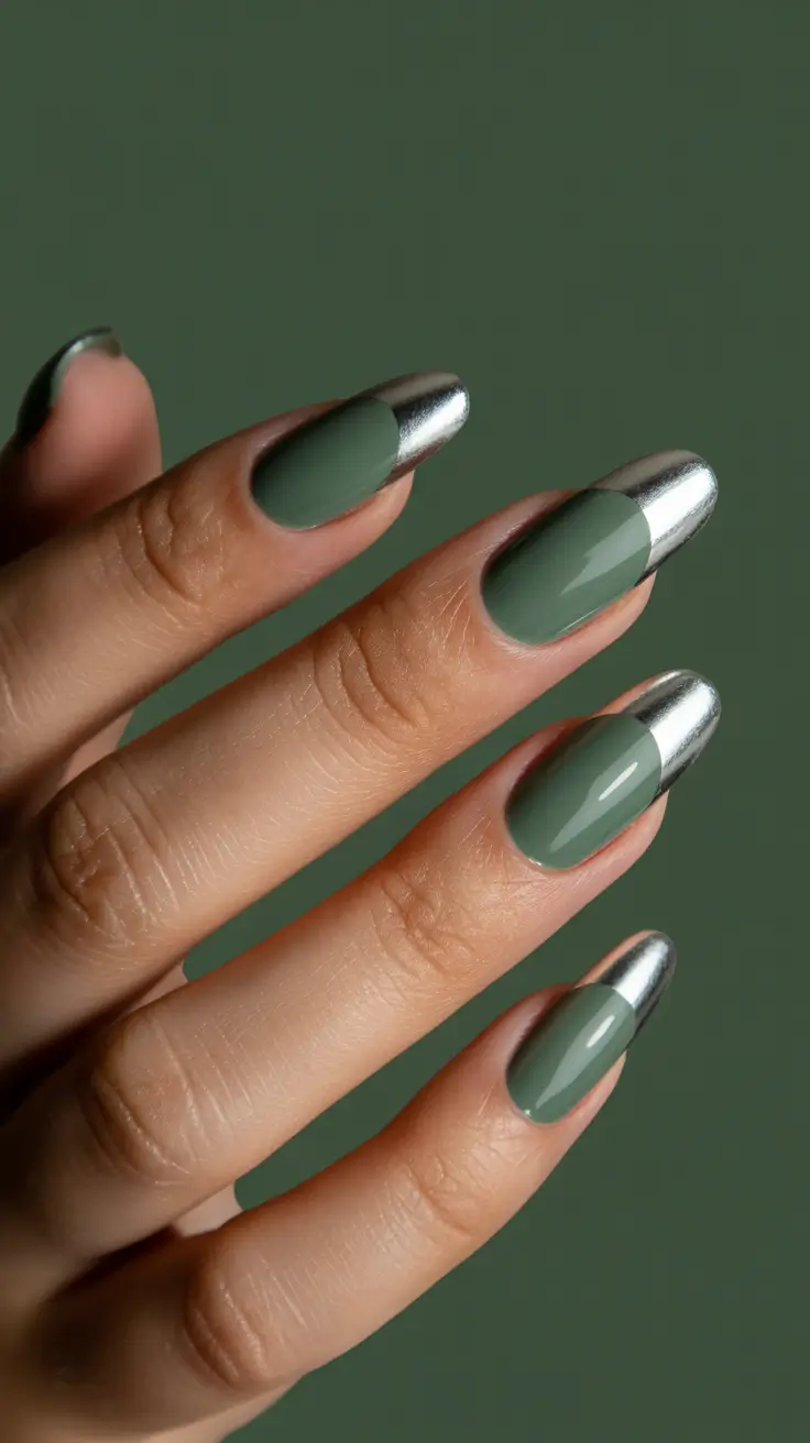 I would suggest butterfingers beside olive green cream paired with silver chrome powders. Stiletto shapes enhance the chrome feel, and *almond* nails give a sophisticated, soft yet edgy style.