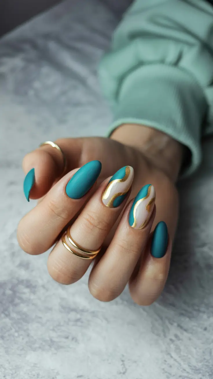 The method is not complicated and can easily be done in the comfort of your home. All you have to do is paint the teal and nude bases, cure, then freehand the gold curves using a thin brush. The negative space is also very forgiving since the nude accents can be your actual nail or any neutral polish underneath. As Betina Goldstein, a four time published nail artist, points out, combining matte and gloss adds a bit of dimension and this design really captures the essence of it.