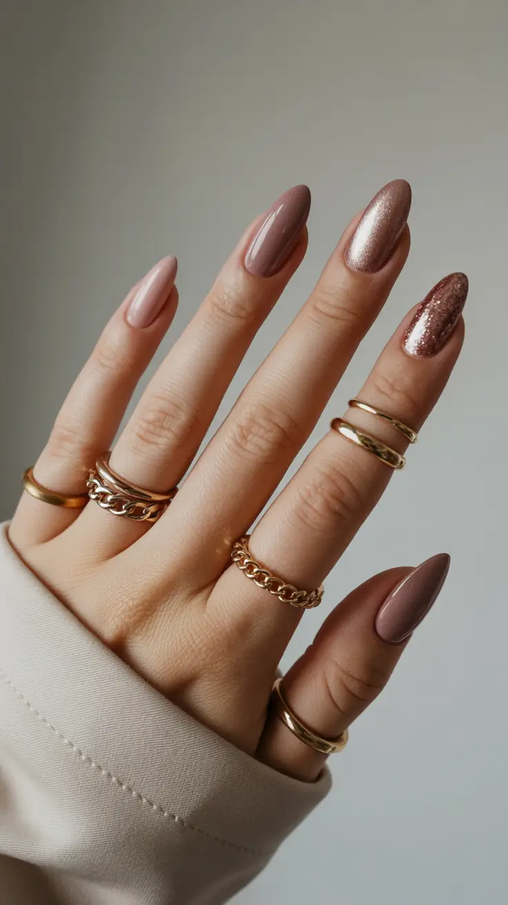 This design is like liquid metal meeting the soft light of early winter. The elongated almond shape is dramatic, especially with rose-gold chrome dripping across the base of blush pink and milky white. The metallic flows in a rebellious manner. It is modern because it’s not in a pattern. To me, this is a statement piece. It is almost jewelry-like. That is ideal for holiday parties, where you wish your nails did all the talking.