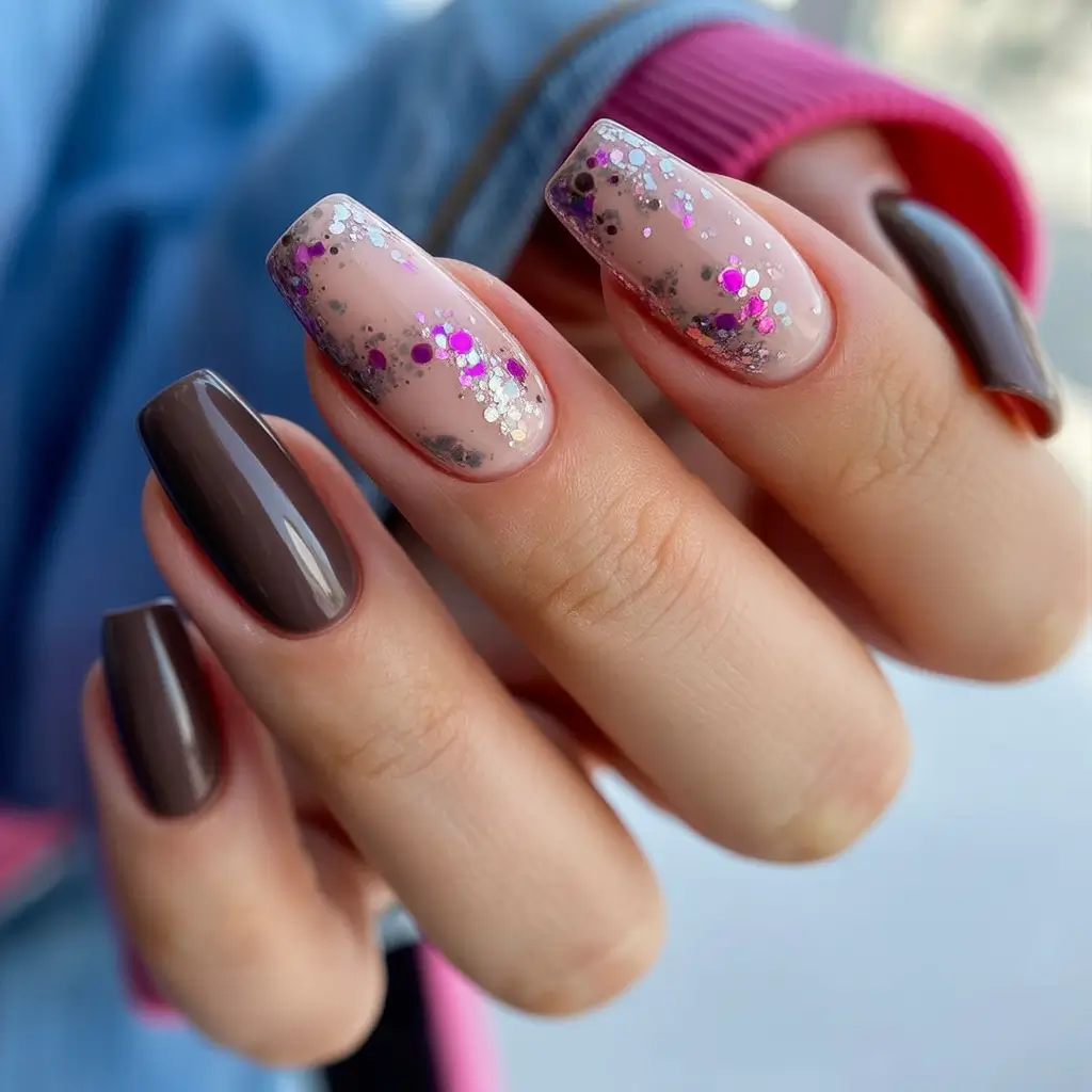 The blend of chocolate, caramel, and coffee with a touch of sparkle may grabe the fall indulgent feeling the most, and the accent with dazzling glitter takes this manicure vibe into the next dimension. Perfect balance of texture and gliz, while the earthy marbles are blended with the glittered accent. The long square shape enhances the dramatic effect, like a cozy sip of warm coffee on a winter morning. the color palette is warm and—slightly—joyous.