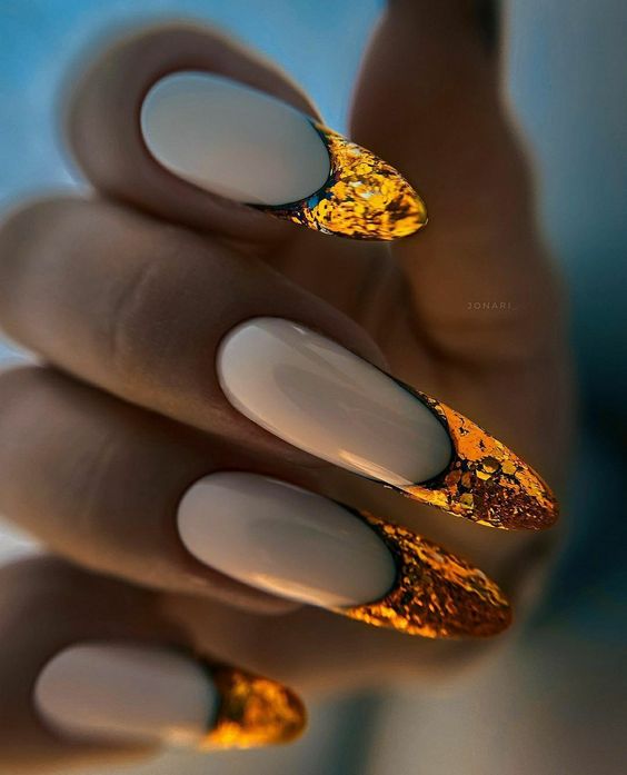 Imagine the warmth of a summer sunset captured on your fingertips. This stunning manicure combines the classic French tip with a luxurious twist. The nails are sculpted into a sleek coffin shape, providing a modern canvas for creativity. The majority of the nail is coated in a sophisticated matte white, while the tips glisten with a rich golden foil, reminiscent of gilded leaves. This design not only screams classy but also incorporates a trendy metallic flair that’s perfect for any summer soirée.