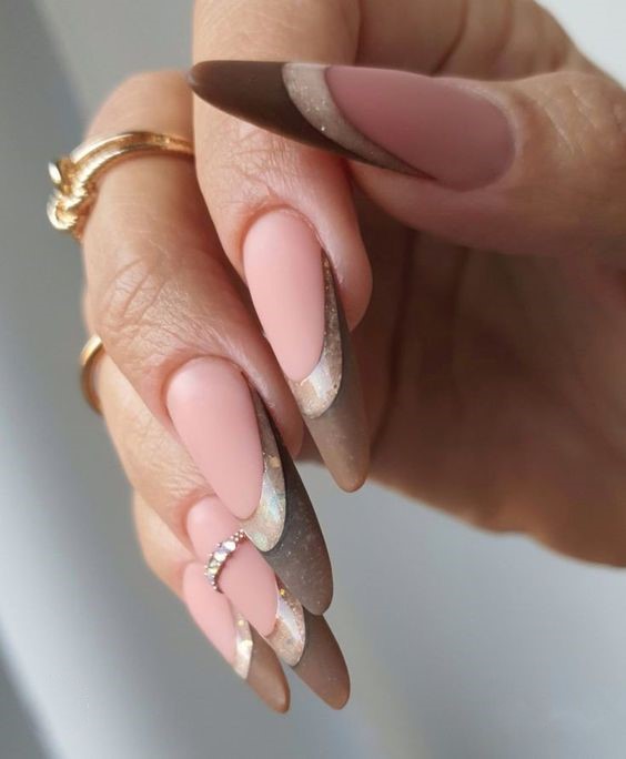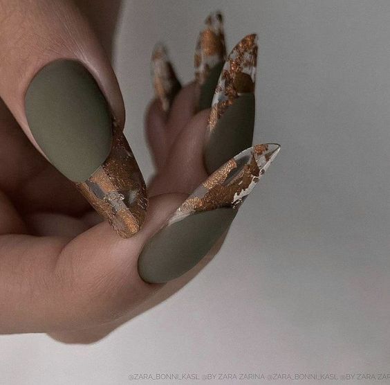 This image presents a daring twist on the French manicure with its stiletto nails that captivate with a matte olive green base. The tips are a work of art, mimicking a rustic, golden-brown marble that gives a nod to natural earth tones. This design is a trend in itself, reflecting the 2024 love for color combos that are both fun and grounded in nature’s own palette.