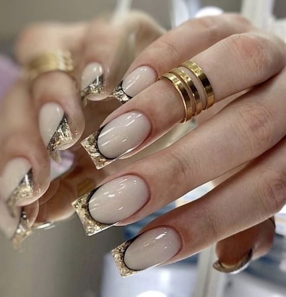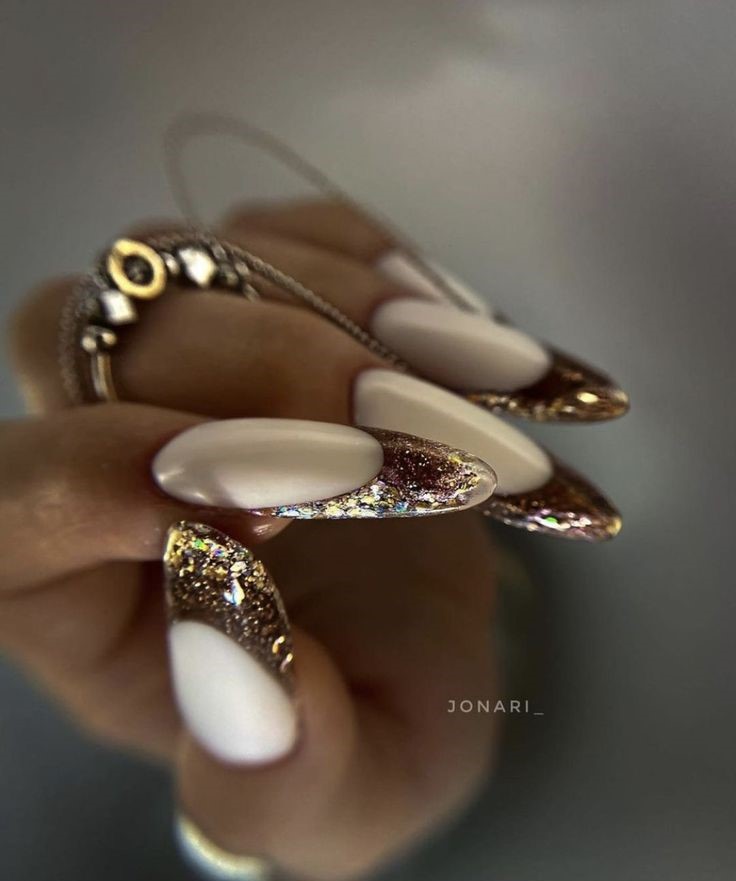 In this universe-inspired design, the oval nails are coated in a milky white base, serving as a backdrop to the cosmic dance of glitter at the tips. The glitter, in a spectrum of golds and bronzes, suggests the twinkling of distant stars. It’s a trendy, gel short square look that’s sure to be a hit for evening events under the summer sky.