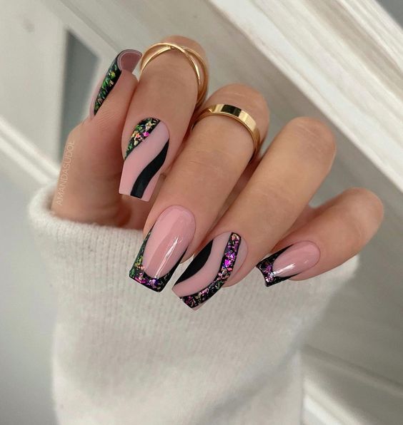 Here, the coffin nails bloom with a soft pink base. However, the true spectacle is the glitter-dipped tips in a rose gold hue, sparkling like morning dew on petals. A single nail on each hand is adorned with a delicate floral accent, perfectly encapsulating the flowers trend of 2024. It’s a classy, feminine choice that adds a touch of fun to any summer ensemble.