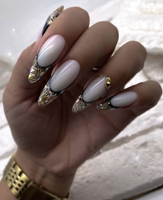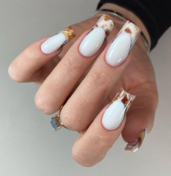 Long and coffin shaped, these nails are the epitome of luxury with their milky white base and gold foil accents. The tips are adorned with a golden splendor that catches the light with every movement. This manicure is the perfect accessory for the classy woman attending a high-profile event or an elegant summer night gala.