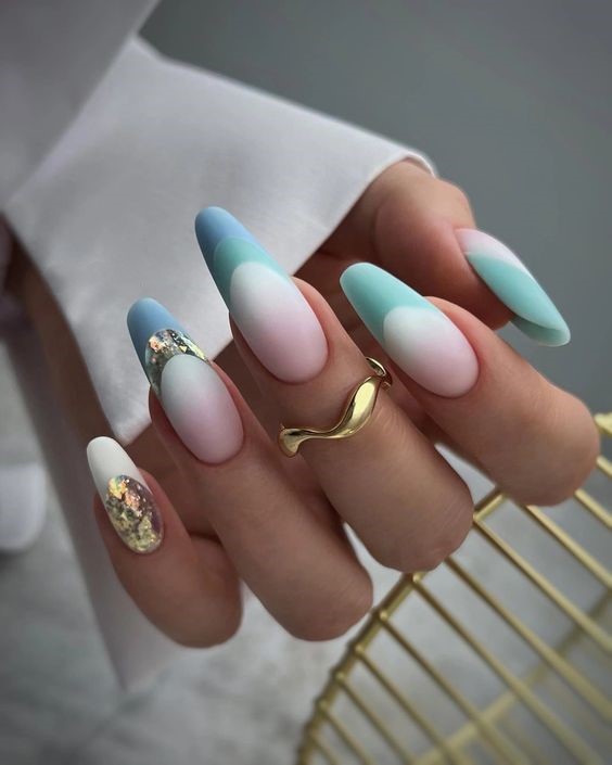 This manicure is a delightful play on color combos, with almond nails that transition from a serene blue to a soft white, creating a beautiful gradient effect. One nail on each hand features a complementary design with a touch of sparkling foil, providing a trendy contrast. It’s a fresh and fun approach to the 2024 nail art scene, ideal for a summer day out or an impromptu getaway.