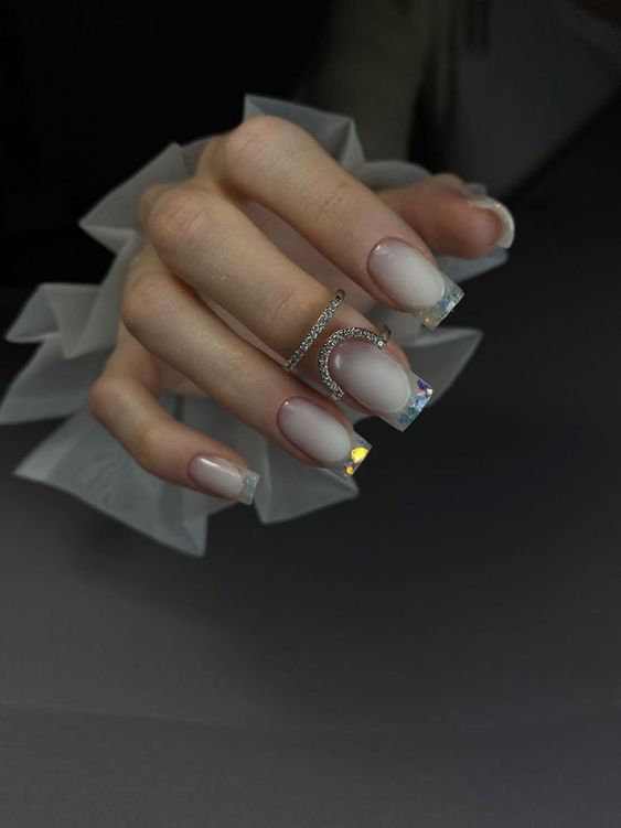 These short square nails blend subtlety with surprise. The pink base keeps things soft and feminine, while the holographic tips catch the light and add an ethereal touch to the manicure. It’s an understated yet trendy way to wear the French tip in 2024.