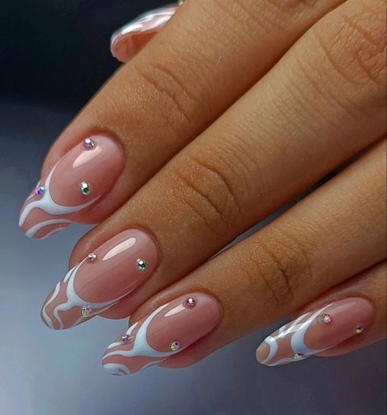 The oval shape of these nails provides a timeless look, but it’s the marble effect with gold accents on the tips that steals the show. This design adds a touch of artistic flair to the simple French manicure, incorporating colors that evoke the natural beauty of the earth. The subtle combination of white, pink, and gold hints at a classy, understated style that’s both trendy and 2024-forward.