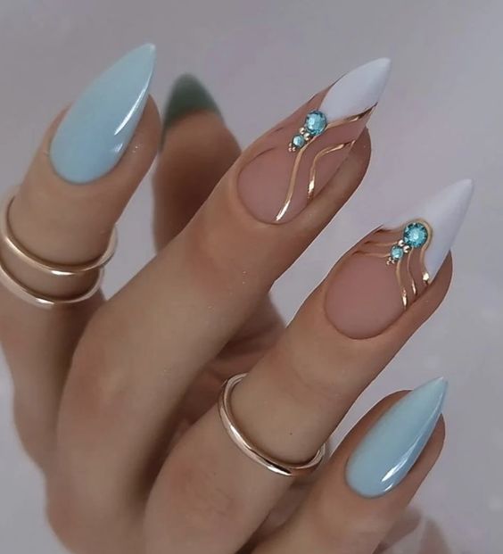 Escape to the cool breezes of the ocean with this refreshing blue and white color palette. The almond shape lends a fun and feminine touch, while the soft blue transitions into a pristine white, creating an 2024 long gel almond look that’s both trendy and soothing. Delicate gold accents and tiny blue gemstones suggest droplets of water on sun-kissed skin, making it the perfect accessory for a beach day or a casual summer walk.