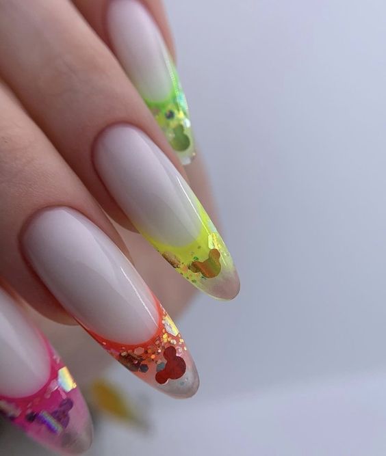 When the summer heat turns up, it’s time to turn to neon colors that reflect the season’s vibrancy. These long nails take the French style to new heights with a color explosion of green, orange, pink, and yellow. The 2024 gel short square design incorporates fun shapes like hearts and confetti, creating a playful effect that’s impossible to ignore. Ideal for festivals, beach parties, or just brightening up your day-to-day, this manicure brings the party to your fingertips.