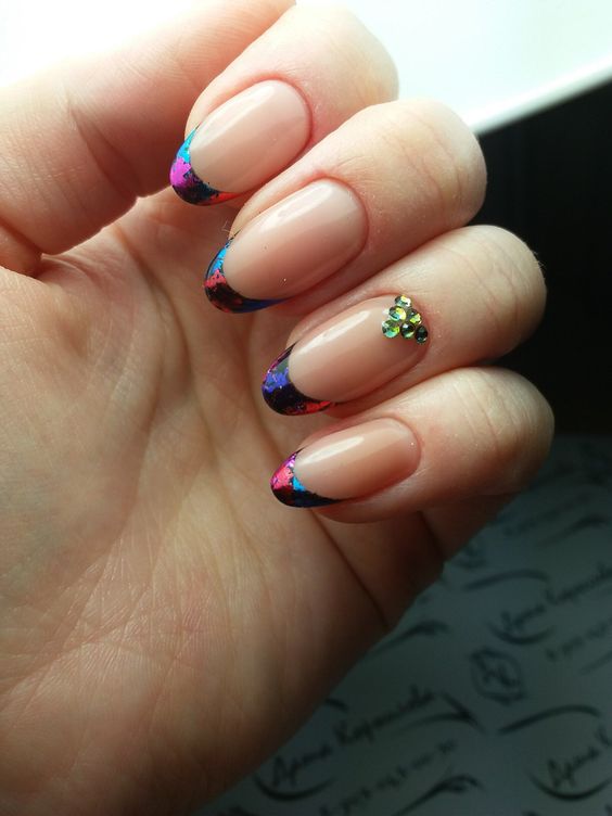 This look combines the soft, pink base of classic French nails with a bold twist. The tips are adorned with a cosmic burst of purple and blue, edged with a precise geometric pattern. Small crystals add a hint of sparkle, making this almond nail design both trendy and fun. It’s perfect for those who love to blend art and precision in their style.