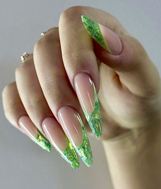 The zest of lime comes alive in this stiletto shaped manicure, merging the freshness of green with the sparkle of summer sunlight. The nails start with a natural pink base and extend into a pointed tip filled with a glittering neon lime design. This look is bold, trendy, and all about having fun in the sun. It’s a perfect match for bold personalities and pairs wonderfully with a cool glass of lemonade by the poolside.