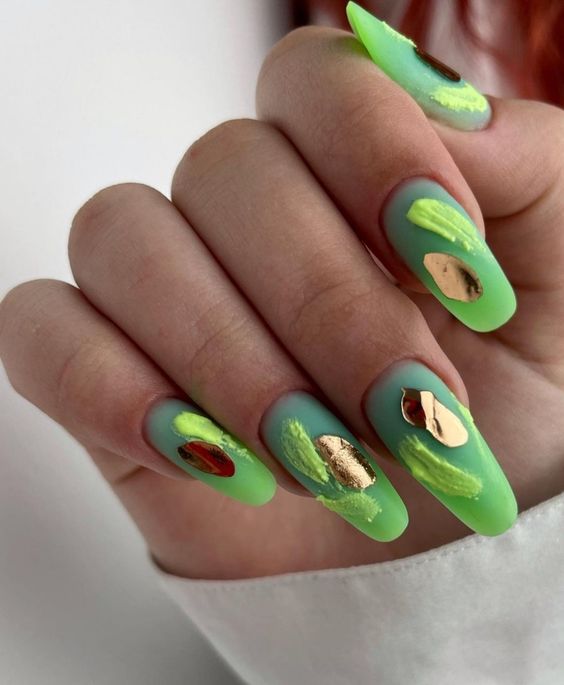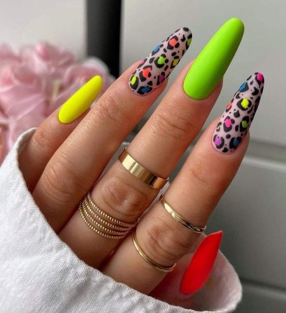 Starting with a bang, we’ve got a set of nails that screams summer fun. This multi-colored design combines bright neon green with a bold leopard print pattern. The alternating solid neon and patterned nails make for a lively contrast that’s sure to catch the eye. The long, stiletto shape adds an edgy sophistication, ideal for those who love a daring aesthetic. These nails are not just about color; they are a statement of confidence and individuality – perfect for those who want their hands to do the talking at summer soirées.