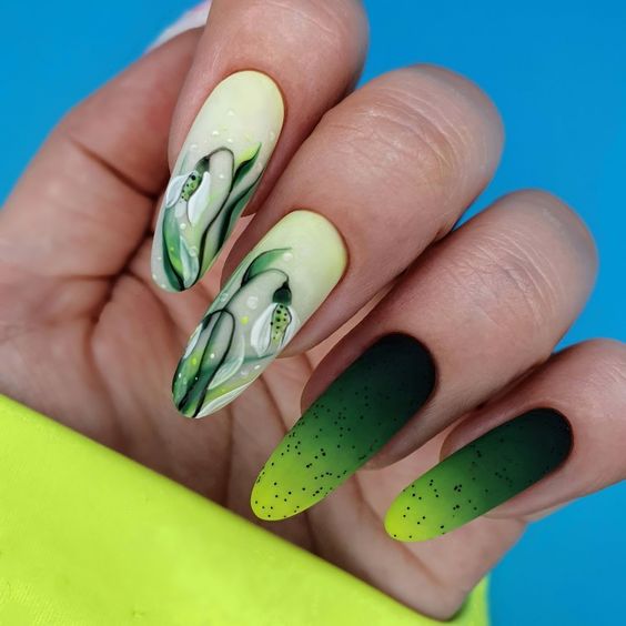 These long nails are an ode to the wilderness with a simple yet striking calla lily design set against a gradient base. The contrast of the dark green on the stiletto tips evokes the deep shades of a forest, while the light yellow base suggests the dawning of a new day. This design is a true work of art, ideal for the bold spirit looking to bring a piece of the wild into their urban jungle.