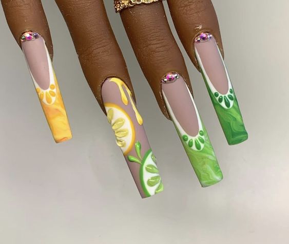 Dive into a zesty lemon-lime fantasy with these coffin shaped nails. The creamy yellow and green designs mimic the refreshing colors of a summer citrus cocktail, complete with a slice of fun and bright zest. Pair these nails with a full-bodied, vibrant summer dress, and you’ll be the embodiment of the season’s joy.