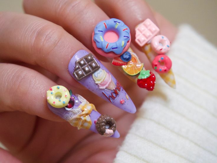 Step into an ice cream parlor with this whimsical stiletto nail design that features a concoction of mint, pink, and chocolate designs, topped with a “cherry” of a jewel. It’s a fun art piece that’s as sweet and bright as it is trendy, perfect for those long summer days when you want to carry the fun of a dessert treat right at your fingertips.