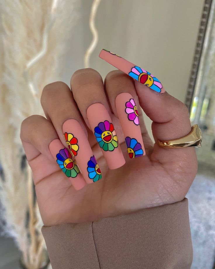 Concluding our showcase is a vibrant pop art floral design that’s as colorful as a summer’s day. The long nails burst with animated flowers, suggesting a playful take on traditional art. This fun look is a celebration of bright and bold, encapsulating the spirit of colorful summer nails 2024 in every petal and hue.