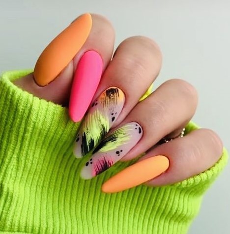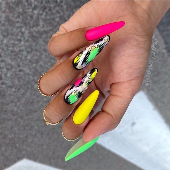 Next in line is a design that mirrors a summer storm with its electric energy. Here, neon pink, yellow, and green are used to create a dynamic and youthful appearance. The long, almond-shaped nails feature a striking mix of solid colors and a black and white splatter pattern that reminds one of a vibrant graffiti wall. This style would pair wonderfully with a simple, plain white tee and denim shorts, letting the nails be the centerpiece of your outfit. It’s a look that balances simple solid backgrounds with complex patterns for a fun punch of personality.