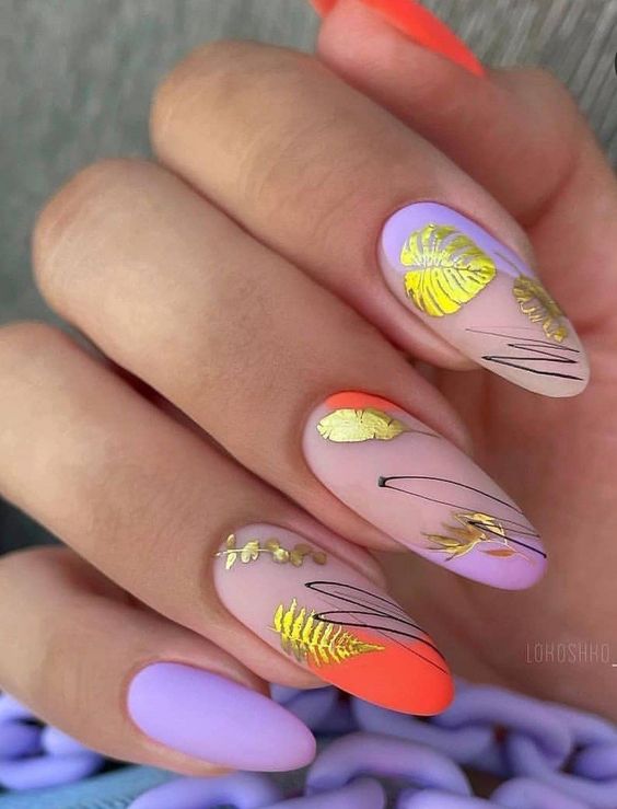 Imagine the golden hour’s glow reflecting off a tropical paradise; that’s what this nail design encapsulates. With a soft lavender base, each nail is adorned with gold foil tropical leaves, bringing an element of luxury to the oval and coffin shapes. The bold pop of matte orange on the short nails adds an unexpected twist, making this design a perfect blend of simple sophistication and bright summer vibes. Pair these nails with a breezy linen dress and strappy sandals for an effortless yet upscale summer look.