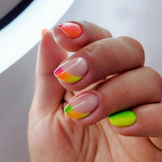 French manicure gets a 2024 update with a burst of neon. These gel short square nails feature a nude base with tips dipped in a rainbow of bright summer hues. It’s a fun take on a classic, providing a simple solid backdrop against the playful tips. This look is trendy yet simple, making it versatile for both day and evening wear. Think of it as your personal summer spectrum at your fingertips, ready to add a pop of color to any neutral outfit.