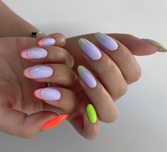 For a more understated yet equally trendy approach, we have the lavender nails with a neon outline. The medium length oval shape is perfect for practicality, while the neon green and orange outlines provide a fun and artistic edge. It’s like the soft summer sky outlined by the brilliant sunset colors—a simple design that speaks volumes about your playful side.
