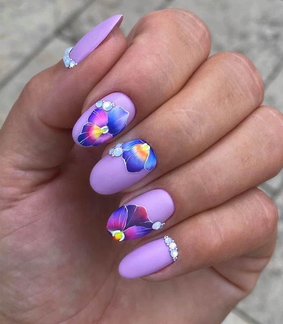 Nail art reaches new heights with this pansy-inspired look. The 2024 gel almond nails serve as a canvas for the delicate flower petals, with jewel accents adding a touch of glamour. These nails would be at home at a summer wedding or garden party, bringing a full and bright burst of nature to your ensemble. It’s simple elegance and intricate design all in one, perfect for those seeking a fun yet neutral tone with their nail choices.