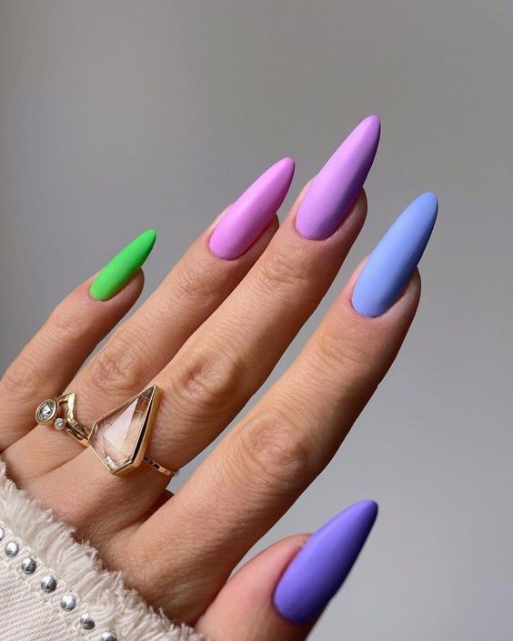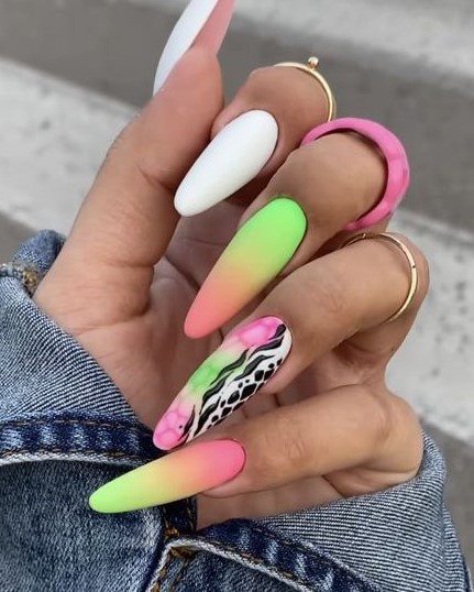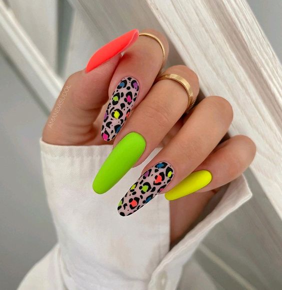 Starting with a bang, we’ve got a set of nails that screams summer fun. This multi-colored design combines bright neon green with a bold leopard print pattern. The alternating solid neon and patterned nails make for a lively contrast that’s sure to catch the eye. The long, stiletto shape adds an edgy sophistication, ideal for those who love a daring aesthetic. These nails are not just about color; they are a statement of confidence and individuality – perfect for those who want their hands to do the talking at summer soirées.