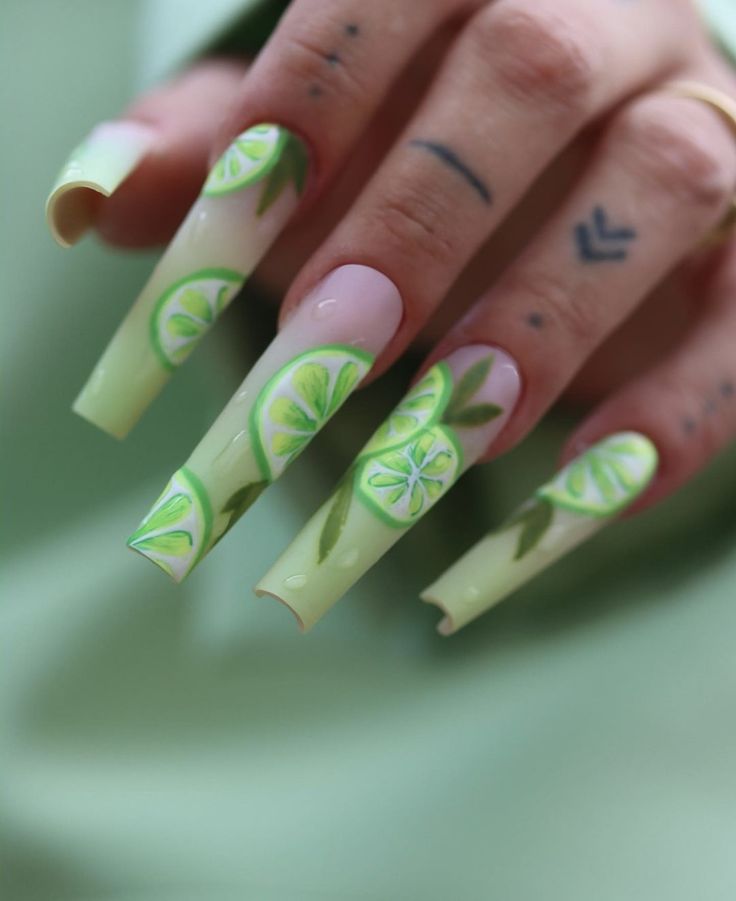 Dive into a zesty lemon-lime fantasy with these coffin shaped nails. The creamy yellow and green designs mimic the refreshing colors of a summer citrus cocktail, complete with a slice of fun and bright zest. Pair these nails with a full-bodied, vibrant summer dress, and you’ll be the embodiment of the season’s joy.
