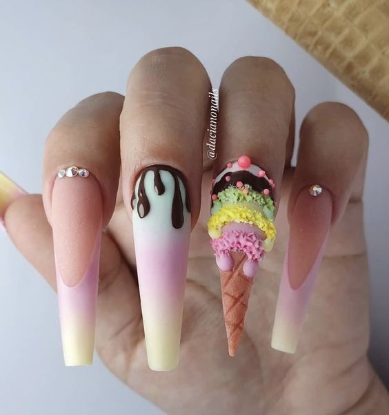 Step into an ice cream parlor with this whimsical stiletto nail design that features a concoction of mint, pink, and chocolate designs, topped with a “cherry” of a jewel. It’s a fun art piece that’s as sweet and bright as it is trendy, perfect for those long summer days when you want to carry the fun of a dessert treat right at your fingertips.