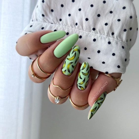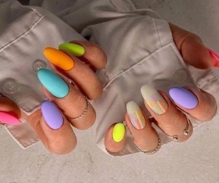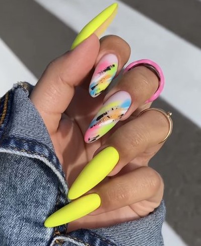 Next in line is a design that mirrors a summer storm with its electric energy. Here, neon pink, yellow, and green are used to create a dynamic and youthful appearance. The long, almond-shaped nails feature a striking mix of solid colors and a black and white splatter pattern that reminds one of a vibrant graffiti wall. This style would pair wonderfully with a simple, plain white tee and denim shorts, letting the nails be the centerpiece of your outfit. It’s a look that balances simple solid backgrounds with complex patterns for a fun punch of personality.
