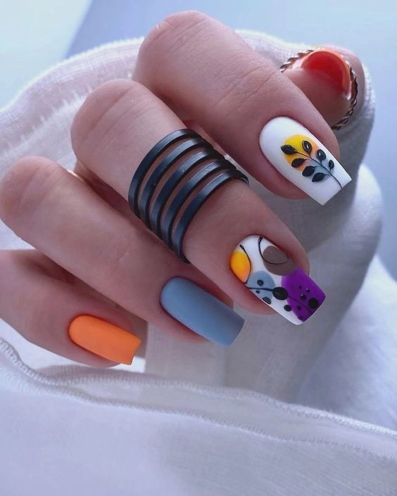 Imagine the golden hour’s glow reflecting off a tropical paradise; that’s what this nail design encapsulates. With a soft lavender base, each nail is adorned with gold foil tropical leaves, bringing an element of luxury to the oval and coffin shapes. The bold pop of matte orange on the short nails adds an unexpected twist, making this design a perfect blend of simple sophistication and bright summer vibes. Pair these nails with a breezy linen dress and strappy sandals for an effortless yet upscale summer look.